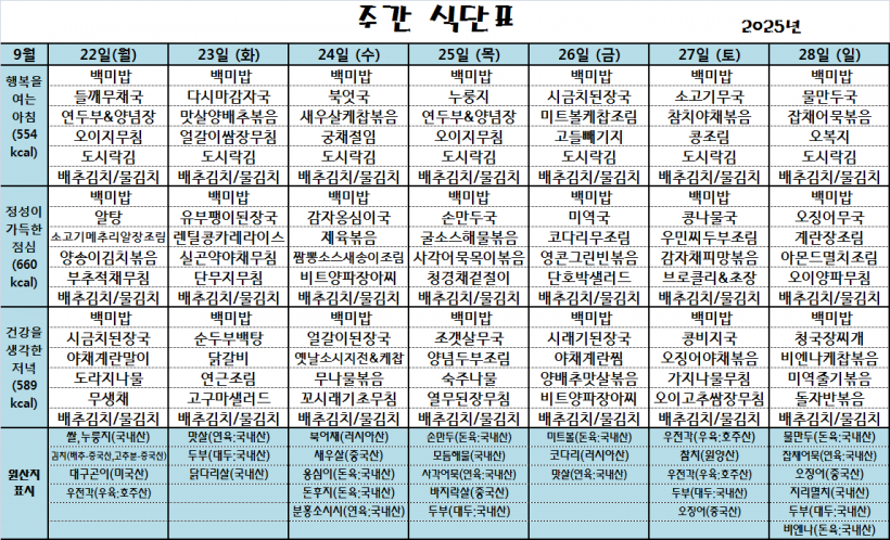 25.09.22(월)~25.09.28(일)_식단표_ 페이지 정보 작성자 관리자 작성일25-09-22 09:51 조회234회 댓글0건 이전글 다음글 목록 본문 *식단은 시장수급사정 또는 업체상황에 의해 변경될 수 있습니다.* 댓글목록 등록된 댓글이 없습니다. 이전글 다음글 목록