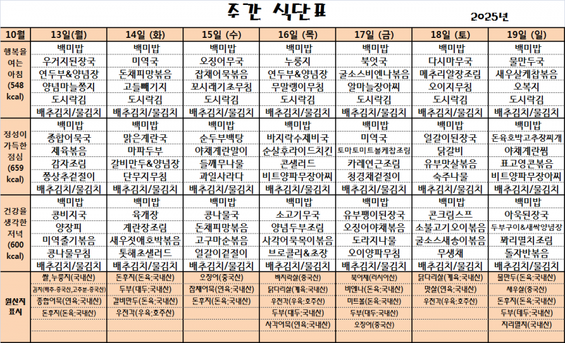 25.10.13(월)~25.10.19(일)_식단표_ 페이지 정보 작성자 관리자 작성일25-10-13 10:12 조회212회 댓글0건 이전글 다음글 목록 본문 *식단은 시장수급사정 또는 업체상황에 의해 변경될 수 있습니다.* 댓글목록 등록된 댓글이 없습니다. 이전글 다음글 목록