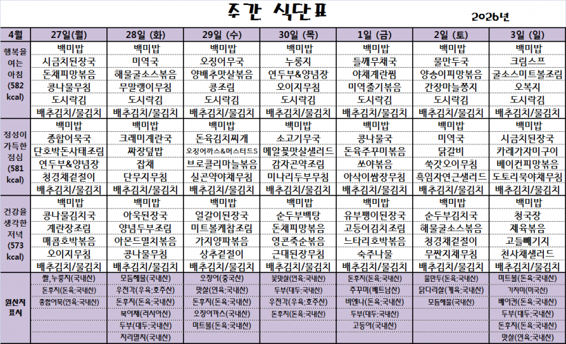26.04.27(월)~26.05.03(일)_식단표_ 페이지 정보 작성자 관리자 작성일26-04-27 09:58 조회4회 댓글0건 다음글 목록 본문 *식단은 시장수급사정 또는 업체상황에 의해 변경될 수 있습니다.* 댓글목록 등록된 댓글이 없습니다. 다음글 목록