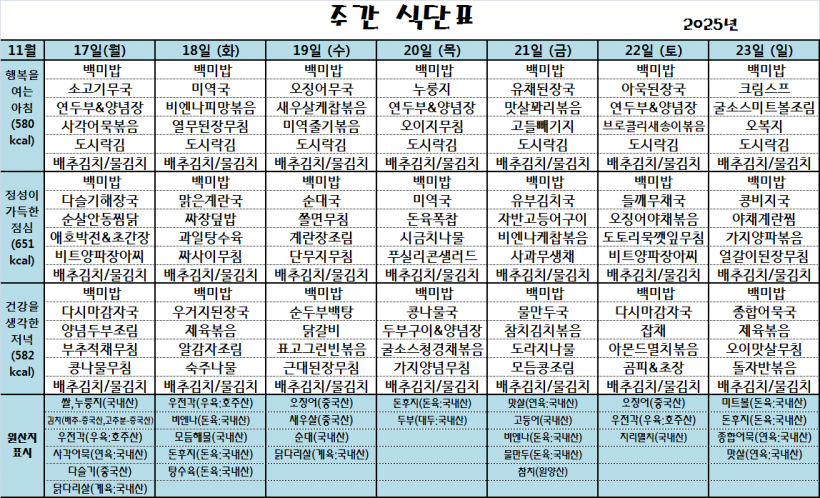 25.11.17(월)~25.11.23(일)_식단표_ 페이지 정보 작성자 관리자 작성일25-11-17 10:07 조회160회 댓글0건 이전글 다음글 목록 본문 *식단은 시장수급사정 또는 업체상황에 의해 변경될 수 있습니다.* 댓글목록 등록된 댓글이 없습니다. 이전글 다음글 목록