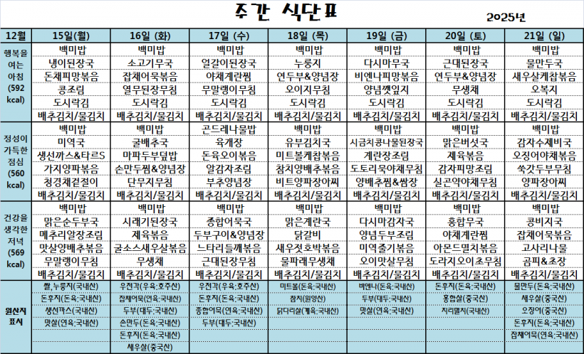 25.12.15(월)~26.12.21(일)_식단표_ 페이지 정보 작성자 관리자 작성일25-12-15 10:04 조회118회 댓글0건 이전글 다음글 목록 본문 *식단은 시장수급사정 또는 업체상황에 의해 변경될 수 있습니다.* 댓글목록 등록된 댓글이 없습니다. 이전글 다음글 목록