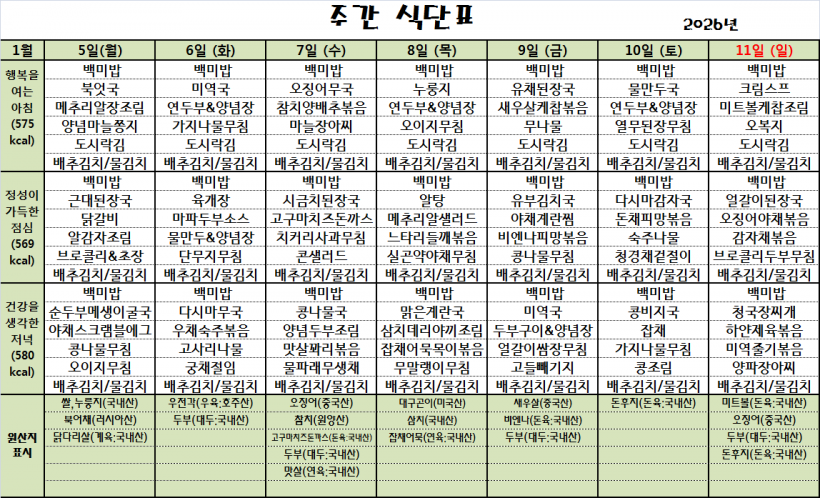 26.1.5(월)~26.1.11(일)_식단표_ 페이지 정보 작성자 관리자 작성일26-01-05 10:03 조회94회 댓글0건 이전글 다음글 목록 본문 *식단은 시장수급사정 또는 업체상황에 의해 변경될 수 있습니다.* 댓글목록 등록된 댓글이 없습니다. 이전글 다음글 목록