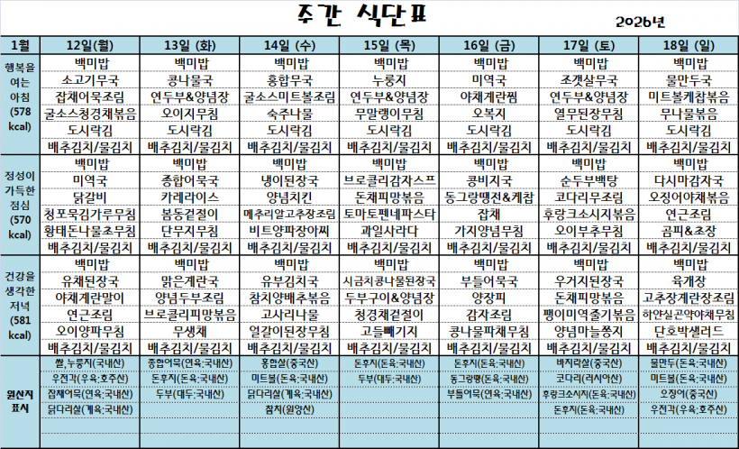 26.01.12(월)~26.01.18(일)_식단표_ 페이지 정보 작성자 관리자 작성일26-01-12 09:53 조회88회 댓글0건 이전글 다음글 목록 본문 *식단은 시장수급사정 또는 업체상황에 의해 변경될 수 있습니다.* 댓글목록 등록된 댓글이 없습니다. 이전글 다음글 목록