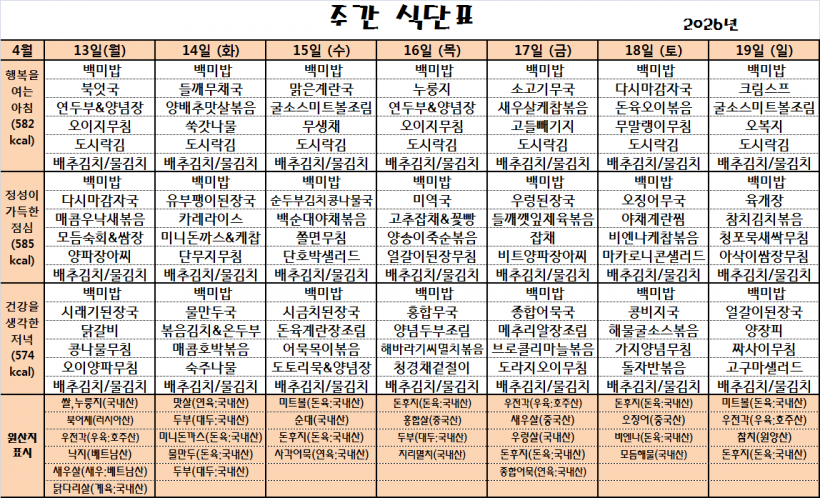 26.04.13(월)~26.04.19(일)_식단표_ 페이지 정보 작성자 관리자 작성일26-04-13 10:12 조회12회 댓글0건 다음글 목록 본문 *식단은 시장수급사정 또는 업체상황에 의해 변경될 수 있습니다.* 댓글목록 등록된 댓글이 없습니다. 다음글 목록