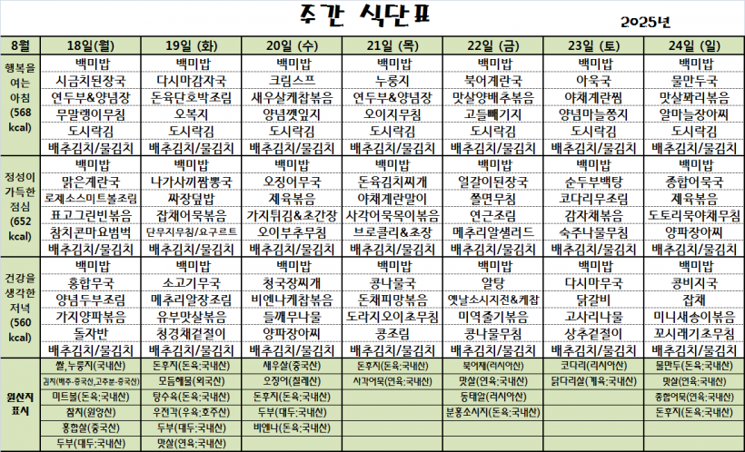 25.08.18(월)~25.08.24(일)_식단표_ 페이지 정보 작성자 관리자 작성일25-08-18 09:55 조회282회 댓글0건 이전글 다음글 목록 본문 *식단은 시장수급사정 또는 업체상황에 의해 변경될 수 있습니다.* 댓글목록 등록된 댓글이 없습니다. 이전글 다음글 목록