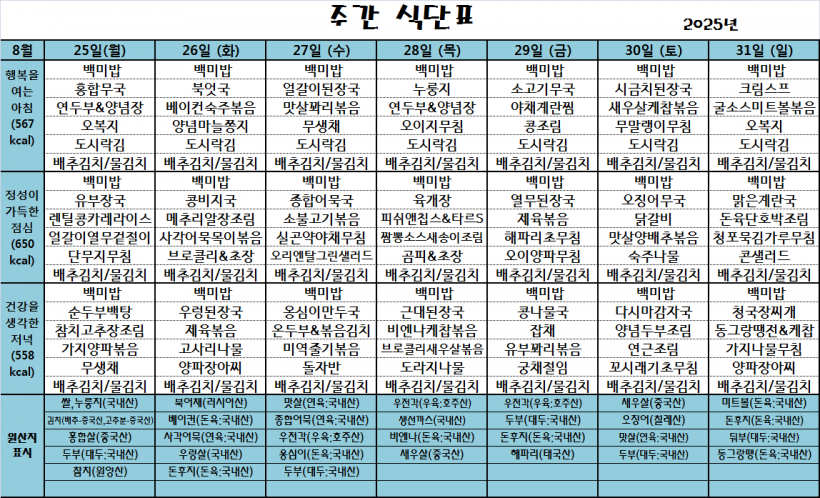 25.08.25(월)~25.08.31(일)_식단표_ 페이지 정보 작성자 관리자 작성일25-08-25 09:48 조회280회 댓글0건 이전글 다음글 목록 본문 *식단은 시장수급사정 또는 업체상황에 의해 변경될 수 있습니다.* 댓글목록 등록된 댓글이 없습니다. 이전글 다음글 목록
