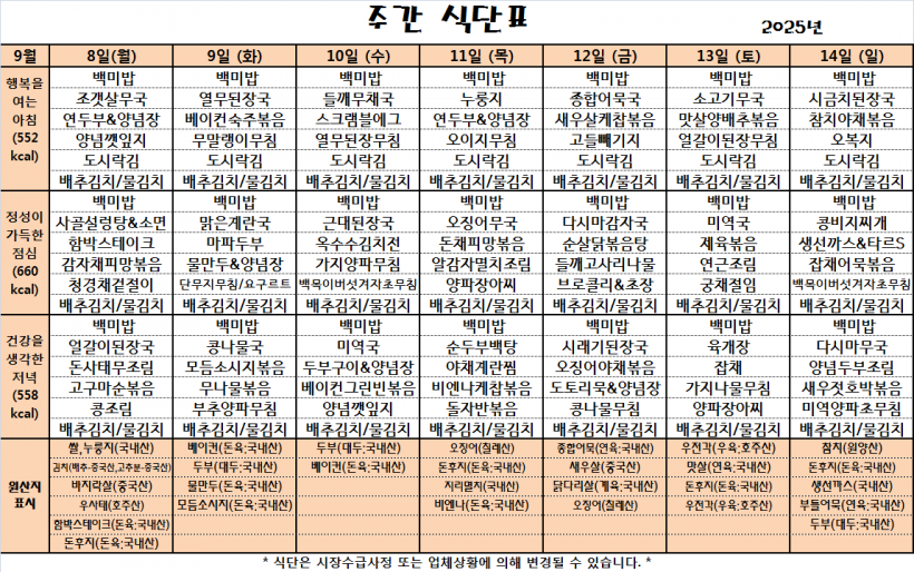 25.09.08(월)~25.09.14(일)_식단표_ 페이지 정보 작성자 관리자 작성일25-09-08 09:47 조회257회 댓글0건 이전글 다음글 목록 본문 *식단은 시장수급사정 또는 업체상황에 의해 변경될 수 있습니다.* 댓글목록 등록된 댓글이 없습니다. 이전글 다음글 목록