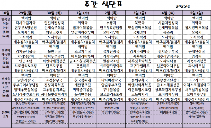25.9.29(월)~25.10.05(일)_식단표_ 페이지 정보 작성자 관리자 작성일25-09-29 09:58 조회240회 댓글0건 이전글 다음글 목록 본문 *식단은 시장수급사정 또는 업체상황에 의해 변경될 수 있습니다.* 댓글목록 등록된 댓글이 없습니다. 이전글 다음글 목록