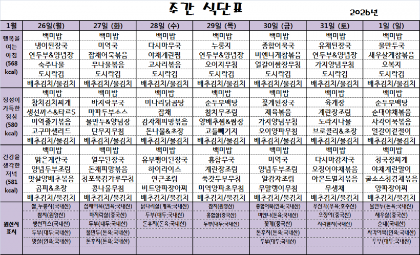 26,1.26(월)~26.2.1(일)_식단표_ 페이지 정보 작성자 관리자 작성일26-01-26 10:05 조회92회 댓글0건 이전글 다음글 목록 본문 *식단은 시장수급사정 또는 업체상황에 의해 변경될 수 있습니다.* 댓글목록 등록된 댓글이 없습니다. 이전글 다음글 목록