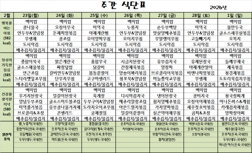 26.2.23(월)~26.3.1(일)_식단표_ 페이지 정보 작성자 관리자 작성일26-02-23 09:55 조회42회 댓글0건 이전글 다음글 목록 본문 *시장은 시장수급사정 또는 업체상황에 의해 변경될 수 있습니다.* 댓글목록 등록된 댓글이 없습니다. 이전글 다음글 목록