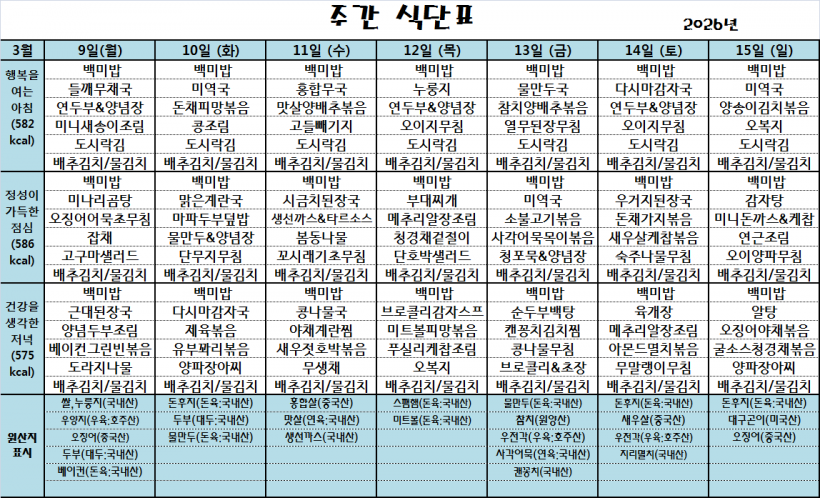 26.03.09(월)~26.03.15(일)_식단표_ 페이지 정보 작성자 관리자 작성일26-03-09 10:14 조회17회 댓글0건 이전글 다음글 목록 본문 *식단은 시장수급사정 또는 업체상황에 의해 변경될 수 있습니다.* 댓글목록 등록된 댓글이 없습니다. 이전글 다음글 목록