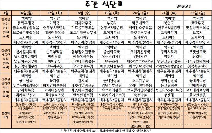 26.03.16(월)~26.03.22(일)_식단표_ 페이지 정보 작성자 관리자 작성일26-03-16 09:58 조회11회 댓글0건 다음글 목록 본문 *식단은 시장수급사정 또는 업체상황에 의해 변경될 수 있습니다.* 댓글목록 등록된 댓글이 없습니다. 다음글 목록